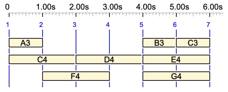 In this tutorial, simple notes ("C4", "D4" etc.) are used following the "English" convention. All time-setting processes could be illustrated using sound-objects or simple notes in other conventions: "Italian/Spanish/French" or "Indian".