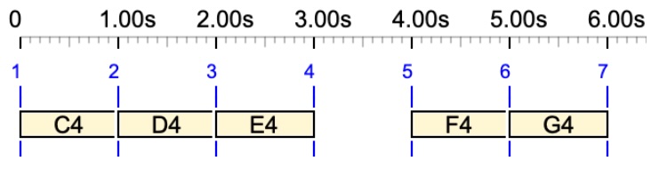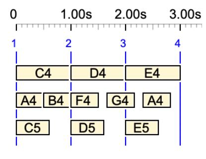 For example, {C4 D4, E4 F4 G4, E5} produces the following time structure with a metronome set to 60 beats per minute: