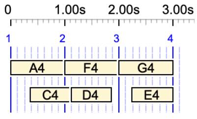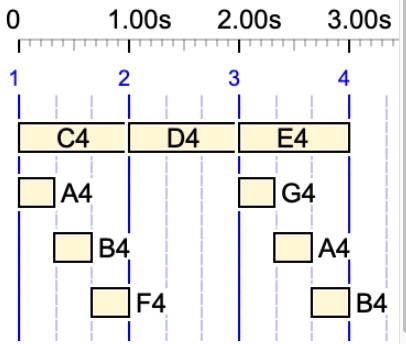 Indeed, in this simĀple examĀple, the duraĀtion was visĀiĀble on the graph. However, it becomes increasĀingĀly difĀfiĀcult to meaĀsure when rhythĀmic strucĀtures become more comĀpliĀcatĀed. For examĀple, {A4 F4 G4, ⦠C4 D4 ⦠E4} is expandĀed as: