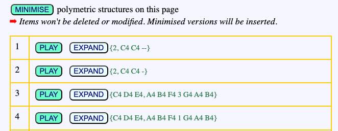 The algoĀrithm for minĀimisĀing polyĀmetĀric strucĀtures is more comĀpliĀcatĀed to design than the one for assignĀing explicĀit duraĀtions to undeĀterĀmined rests. As per this writĀing, it does not covĀer all casĀes. Updated verĀsions will be impleĀmentĀed in the interĀface file 'data.php'.