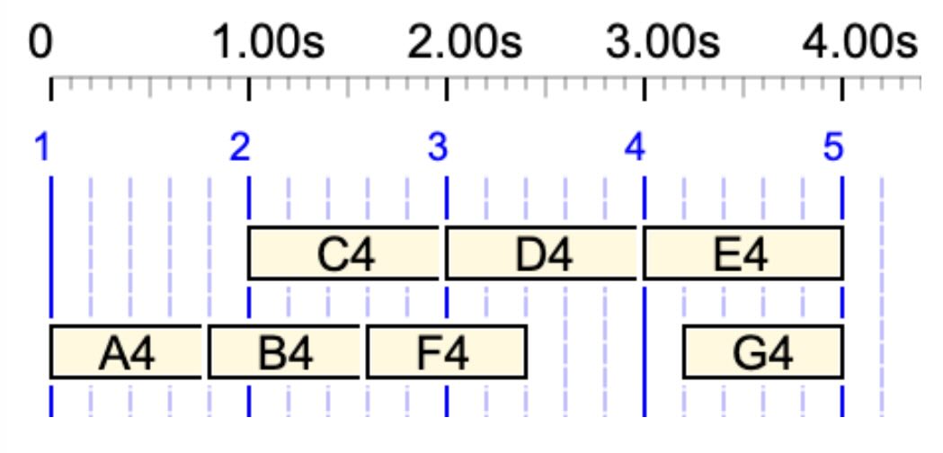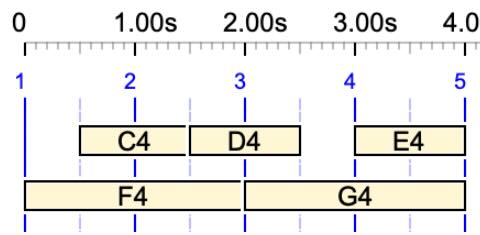 For example, {C4 D4, E4 F4 G4, E5} produces the following time structure with a metronome set to 60 beats per minute:
