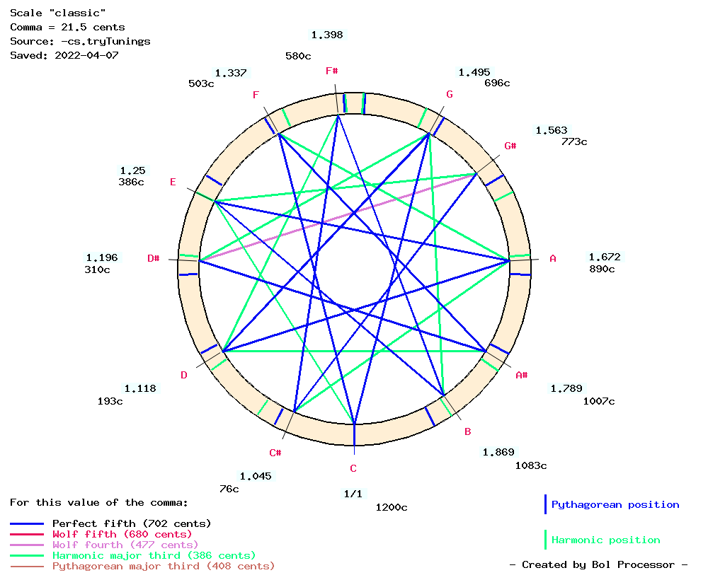 Each musical work has been compared with a set of tuning schemes implemented on the Bol Processor. These include temperaments documented by Pierre-Yves Asselin ([1985], 2000) and "natural" scales systematically constructed — see pages Microtonality and Creation of just-intonation scales.